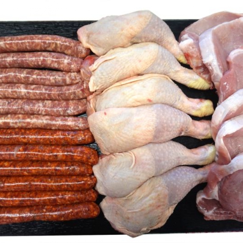 Réf. : 89Origine régionale et française -12 Chipolatas natures, 12 Merguez, 12 Côtes porc, 6 Cuisses de poulet marinées