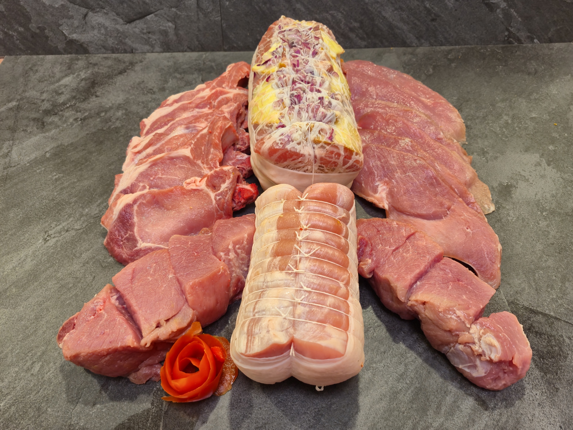 Origine régionale, porc élevé sur paille -1kg Rôti filet farci, 1kg Rôti filet, 6 Côtes de porc, 6 Escalopes