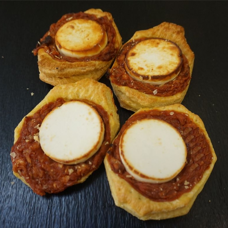 Fromage de chèvre, concentré de tomate, confit d'oignon et lardons