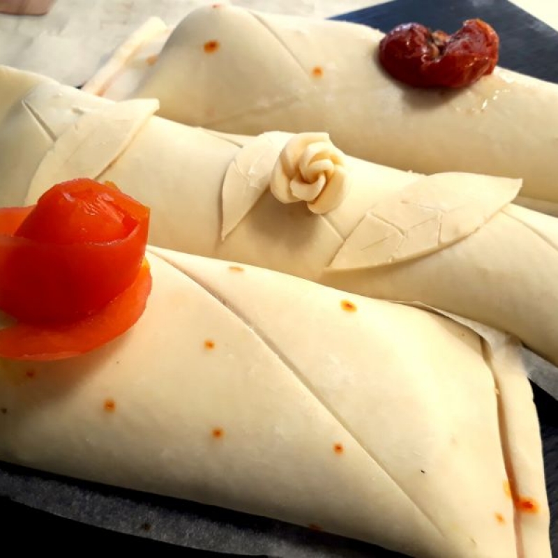 En savoir +Pâte feuilleté, emmental, jambon blanc, oignons confits