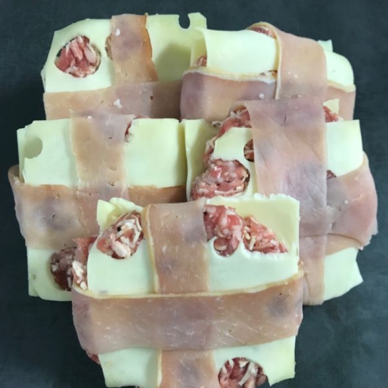 Farce de veau à l'emmental, entouré d'emmental et de bacon